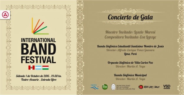 | Con Laszlo Marosi como maestro invitado y Eva Lopzyc como compositora invitada, el próximo sábado 1º de octubre a las 19:30 hs. se realizará un Concierto de Gala en el Teatro Acuario, con entrada libre y gratuita. Participarán de este evento las siguientes agrupaciones: -Banda Sinfónica Estudiantil Santísimo Nombre de Jesús. Director: Alfredo Enrique Ponce Guevara (Lima. Perú). - Orquesta Sinfónica de Villa Carlos Paz. Director: Martín A. Vega. - Banda Sinfónica Municipal. Director: Martín A. Vega. Este presentación se lleva a cabo en el marco del International Band Festival, un encuentro de bandas sinfónicas infanto juveniles que desde hace 23 años se realiza en la ciudad con el objetivo de compartir y difundir la música de cada región. Las bandas se reúnen en centro del país para intercambiar conocimientos, brindando diferentes presentaciones, en salas de conciertos, espacios al aire libre, escuelas y culminando con un desfile por las calles céntricas de nuestra ciudad. |
