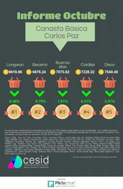 | El Centro de Estudios Sociales para la Inclusión y Desarrollo (CESID) publicó el informe del mes de octubre de la canasta básica en Villa Carlos Paz, donde se registró una baja del 1.24% con respecto al mes anterior. El informe arrojó que se produjo una disminución de precios en los rubros "verduras, frutas y huevos" 5.75%, "lácteos y fiambres" 4.84%, "limpieza y perfumería" 2.52% y "almacén" 0.48%. Por otra parte aumentaron los siguientes rubros: "bebidas" 4.44%, "panadería" 3.61% y "carne" 1.95% (se destaca el pollo que aumentó un 8.52%). Por otro lado, también se dieron a conocer las variaciones de precios de los medicamentos en el último año, donde puede observarse incrementos desde el 64 al 199%, muy por encima del ìndice general de la economía. Sobre la canasta básica, el CESID determinó que el supermercado con mejores precios continúa siendo la cadena Long Wang ($6.619, 16), mientras que el Disco ($7.540,40), el más caro. |
