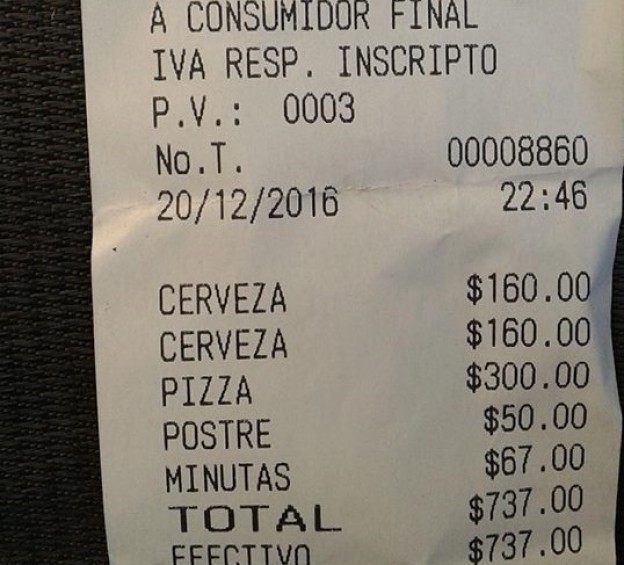 Según figura en el ticket del consumo, una pizza de rockefort costó 300 pesos, mientras que el precio de una cerveza es de 160. "Llegamos al "Restaurante"(si es que se le puede llamar así) ordenamos al mozo, una pizza de roquefort y una cerveza, al rato pedimos una cerveza más y a continuación un postre (tiramisu) nada más que eso consumimos!! Grande fue nuestro asombro al pedir la cuenta,tal como lo ilustra la foto $737,!!!!", expresó el usuario en su cuenta de la red social. |