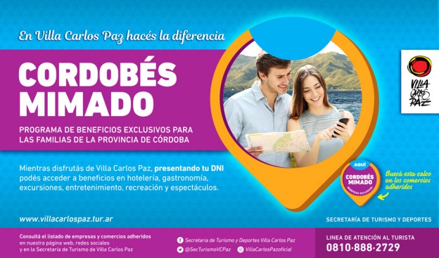 | La Secretaría de Turismo y Deportes pondrá en marcha para los meses de agosto y septiembre una importante campaña de beneficios exclusivos para turistas de la provincia de Córdoba. Los mismos comprenden distintos beneficios en hotelería, gastronomía y entretenimientos a través de más de 100 hoteles y distintos comercios adheridos, los cuales contarán con un calco autoadhesivo identificatorio. Además, podrán consultarse vía web en: www.villacarlospaz.tur.ar o personalmente en las oficinas de turismo (avenida San Martín 400). El objetivo de esta iniciativa es devolverle a la familia Cordobesa que visita la villa durante todo el año, un beneficio durante su estadía. La campaña se presentará en distintas localidades de la provincia comenzando la semana que viene por las ciudades de La Falda y Cosquín con la presencia del Intendente Esteban Avilés, el Secretario de Turismo y Deportes Sebastián Boldrini, y los intendentes de esas localidades. Del lunes 7 al viernes 11 de agosto se visitará el resto de las principales localidades de la provincia de Córdoba. |