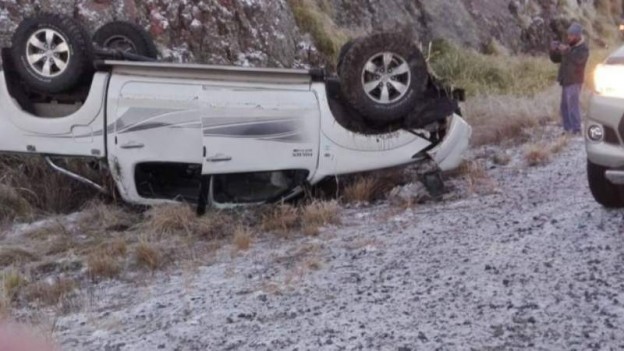 | Una camioneta Toyota Hilux volcó en horas de este martes por la madrugada en el camino de las Altas Cumbres como consecuencia de la presencia de hielo en la carpeta asfáltica, afortunadamente, el accidente no tuvo víctimas fatales. Desde la Policía Caminera informaron que también se registraron otros despistes sin mayores consecuencias a causa del fenómeno climático, por lo que solicitaron circular con precaución. |