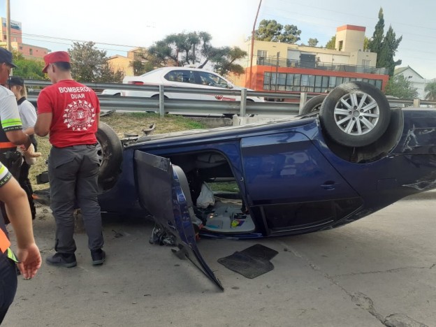 Este domingo por la tarde se registró un impresionante accidente en avenida Uruguay de Carlos Paz, donde un vehículo que circulaba desde el Cu-Cú hacia el puente terminó volcando sobre la carpeta asfáltica. Se presume que sufrió un desperfecto mecánico cuando se le reventó una cubierta, chocó contra el guardarrail, cayó sobre la colectora y quedó tumbado. En el vehículo circulaban cinco personas en total, dos mayores y tres menores que iban con cinturón de seguridad, por lo cual no hubo que lamentar heridos. De manera inmediata, se hizo presente personal de Seguridad VCP, dando aviso a los bomberos voluntarios, la Policía y el servicio de emergencias. |