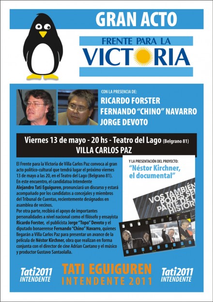 | El Frente para la Victoria de Villa Carlos Paz convoca e invita al gran acto político-cultural que tendrá lugar el próximo viernes a las 20, en el Teatro del Lago, ubicado en calle Belgrano 81. El candidato a intendente Alejandro "Tati" Eguiguren, pronunciará un discurso y estará acompañado por los candidatos a concejales y miembros del Tribunal de Cuentas, recientemente designados en asamblea de vecinos. Por otra parte, el dirigente cooperativista recibirá el apoyo de importantes personalidades a nivel nacional como el filósofo y ensayista Ricardo Foster, el publicista Jorge "Topo" Devoto y el diputado bonaerense Fernando "Chino" Navarro, quienes llegarán a nuestra ciudad para presentar un avance de la película de Néstor Kirchner, obra que realizan en forma conjunta con el director de cine Adrián Caetano y el músico y productor Gustavo Santaolalla . "Néstor Kirchner, el documental" La idea de realizar esta película nació durante las extraordinarias manifestaciones de dolor colectivo que siguieron a la muerte del ex Presidente Néstor Kirchner, el pasado 27 de octubre de 2010. Para su elaboración se trabaja con material de archivo. Pero la clave de la película y el objetivo de su concreción es recuperar la enorme cantidad de testimonios que sobre el ex presidente han registrado por miles de argentinos con cámaras de video y fotográficas, teléfonos inalámbricos y diversos equipos particulares. La idea es mostrar diferentes "miradas" de Néstor Kirchner, de sus innumerables recorridos por los más diversos rincones del país, de los cientos de ojos populares que lo retrataron, que lo siguieron y que dejaron huella. Para informar acerca de la recopilación de este material un sitio en internet, cuya dirección es www.yoquieroserparte.com.ar. No obstante, el equipo que lleva adelante este documental está recorriendo nuestro país para motivar la participación en este proyecto cultural. |