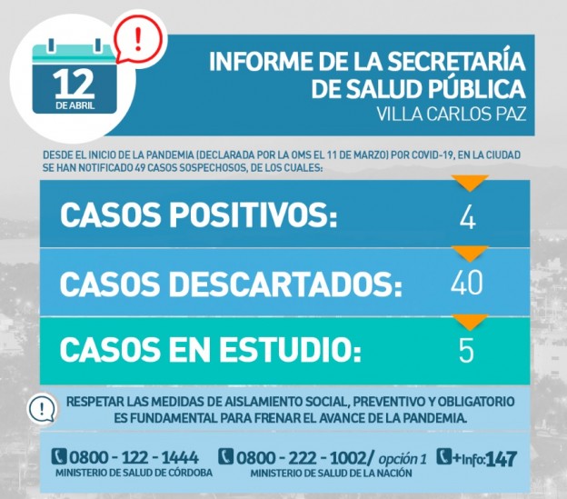 | El Gobierno de la Ciudad a través de la Secretaría de Salud Pública informa sobre la situación del Coronavirus en Villa Carlos Paz. Desde el inicio de la Pandemia (declarada por la OMS el 11 de marzo) por Covid-19, en la Ciudad se han notificado 49 casos sospechosos, de los cuales: 4 han dado positivos 40 han sido descartados 5 se encuentra en estudio Respetemos las Medidas de Aislamiento Social, Preventivo y Obligatorio, es fundamental para frenar esta Pandemia. Si necesitas atención médica, recordá que también podés dirigirte al Centro de Atención Periférica de tu Barrio (Dispensarios). Ministerio de Salud de Córdoba: 0800-122-1444 Ministerio de Salud de la Nación: 0800-222-1002 Más información: 147 |