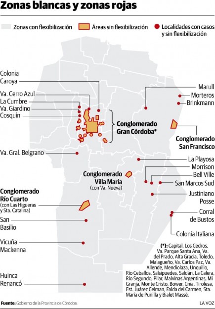| El Centro de Operaciones Emergencias Provincial (COE) informó que de acuerdo a criterios epidemiológicos y de características de densidad poblacional de las distintas localidades, se clasifican las distintas áreas en dos categorías: zonas rojas y zonas blancas. Se consideran zonas blancas aquellas conformadas por localidades que no cuentan con casos positivos activos y que no se encuentren dentro de los grandes conglomerados. Villa Carlos Paz se encuentra dentro de las ciudades que pertenecen al Gran Córdoba, por lo cual por el momento no está permitida la posibilidad de realizar esparcimiento en un radio de 500 metros y las restricciones dispuestas, conforme a la comunicación conjunta que realizó la Provincia de Córdoba junto a la Ciudad Autónoma de Buenos Aires y las provincias de Buenos Aires y Santa Fe. Se considera Zona Roja a aquellas ciudades que se encuentren dentro de los cuatro grandes conglomerados definidos por el Centro de Operaciones de Emergencia, que son: Córdoba y Gran Córdoba (Córdoba Capital, Los Cedros, Villa Parque Santa Ana, Villa del Prado, Alta Gracia, Toledo, Malagueño, Villa Carlos Paz, Villa Allende, Mediolaza, Unquillo, Río Ceballos, Salsipuedes, Saldan, La Calera, Río Segundo, Pilar, Malvinas Argentinas, Mi Granja, Monte Cristo, Bower, Colonia Tirolesa, Estación Juárez Celman, Falda del Carmen, Santa María de Punilla y Bialet Masse). |