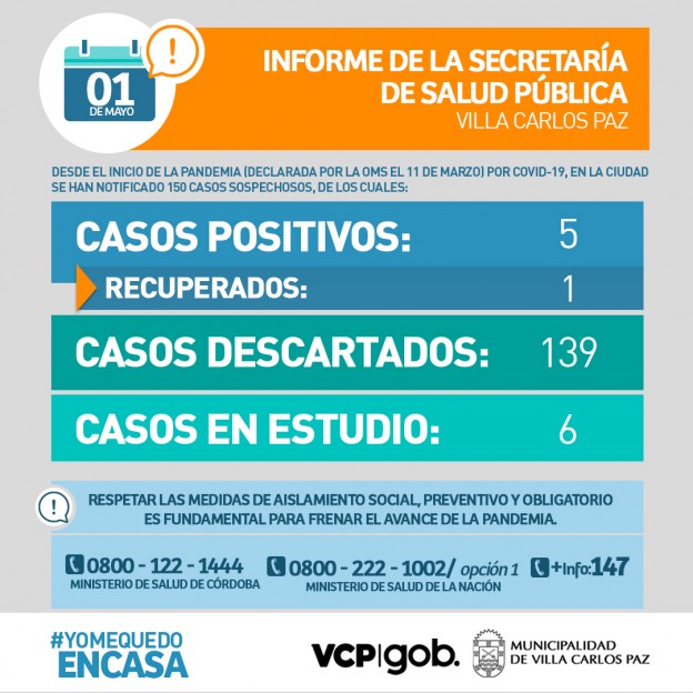 | El Gobierno de la Ciudad a través de la Secretaría de Salud Pública informa sobre la situación del Coronavirus en Villa Carlos Paz. Desde el inicio de la Pandemia (declarada por la OMS el 11 de marzo) por Covid-19, en la Ciudad se han notificado 150 casos sospechosos, de los cuales: 5 han dado positivos (1 recuperado) 139 han sido descartados 6 se encuentran en estudio Respetemos las Medidas de Aislamiento Social, Preventivo y Obligatorio, es fundamental para frenar esta Pandemia. Si necesitas atención médica, recordá que también podés dirigirte al Centro de Atención Periférica de tu Barrio (Dispensarios). Ministerio de Salud de Córdoba: 0800-122-1444 Ministerio de Salud de la Nación: 0800-222-1002 Más información: 147 |