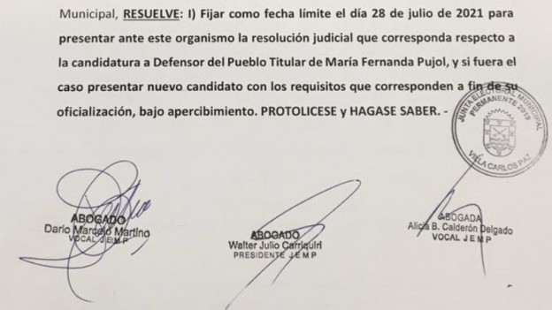 | La Junta Electoral Municipal fijó el 28 de julio como fecha límite para que la alianza PRESENTE confirma la lista que participará de la elección del Defensor del Pueblo de Villa Carlos Paz. Se encuentra judicializada la participación de la abogada María Fernanda Pujol como candidata titular del frente, luego que fuese rechazada por no cumplir los requisitos de la Carta Orgánica. El organismo compuesto por Walter Carriquiri, Alicia Calderón Delgado y Darío Martino justificó la resolución en la necesidad de contar con un tiempo prudencial para conocer fehacientemente los candidatos que animarán la contienda, prevista para el 22 de agosto, y poder imprimir la Boleta Única de Sufragio y difundir la elección entre la ciudadanía. «Fijar como fecha límite el día 28 de julio de 2021 para presentar ante este organismo la resolución judicial que corresponda respecto a la candidatura a Defensor del Pueblo Titular de María Fernanda Pujol, y si fuera el caso, presentar nuevo candidato con los requisitos que corresponden a fin de su oficialización, bajo apercibimiento»; reza el comunicado dado a conocer en el día de hoy. |